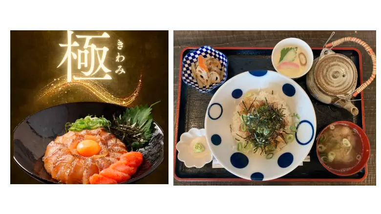 左:「極」を極めた贅沢な「めん鯛丼」 / 右:お出汁と味わう「鯛茶漬け定食」