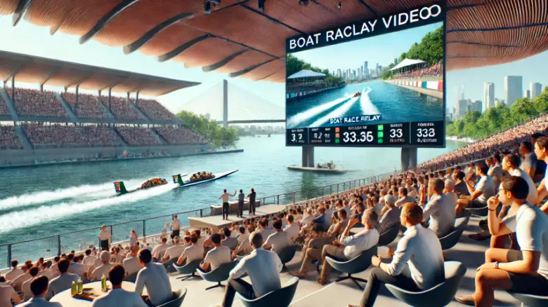 ボートレース場の大画面にリプレイ映像が表示され、観客が注目している様子