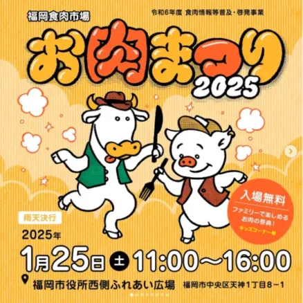 福岡食肉市場お肉まつり2025公式ポスター。家族で楽しめるお肉の祭典が1月25日(土)11:00~16:00に福岡市役所西側ふれあい広場で開催されます。入場無料!