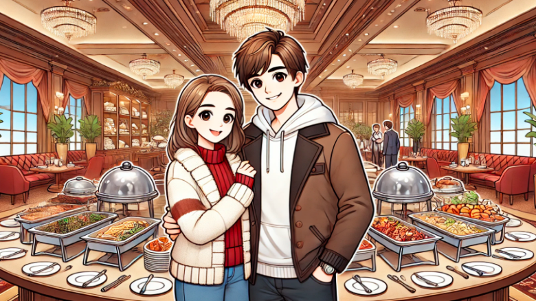 カジュアルな冬服でリラックスしながら、高級ホテルの豪華ビュッフェを楽しむ若いカップル。