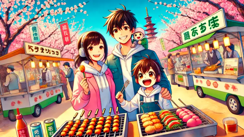 福岡梅まつりで満開の梅を背景に家族がキッチンカーエリアを楽しむ様子。