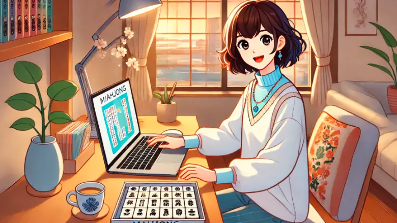 MacBookを使ってMJ麻雀をプレイする20代女性を描いたアニメ風イラスト。ミニマルなデスクと心地よい雰囲気の中でゲームを楽しむ様子が魅力的です。