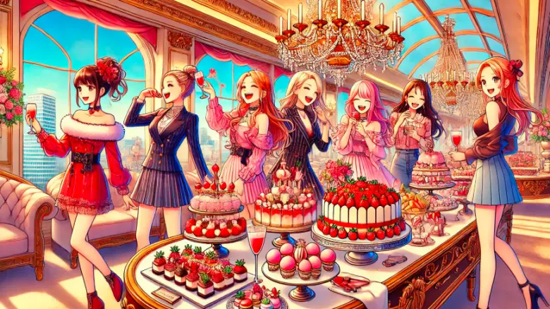 20代・30代女性が高級ホテルでいちごスイーツビュッフェを満喫している様子を描いたアニメ風イラスト。華やかで上品な雰囲気が特徴です。スイーツビュッフェ2025 福岡