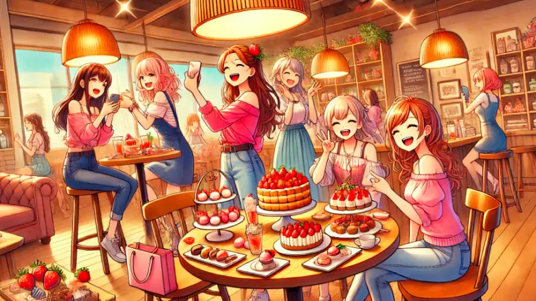 いちごスイーツが並ぶカフェで、女性たちが楽しそうに写真を撮りながら食事をしている様子を描いたアニメ風イラスト。カジュアルで温かい雰囲気が特徴。スイーツビュッフェ2025 福岡