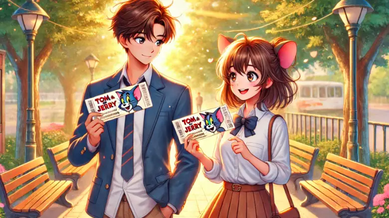 高校生カップルがトムとジェリー展のチケットを手に笑顔を浮かべる暖かなアニメ風イラスト。青春のワクワク感を表現しています。