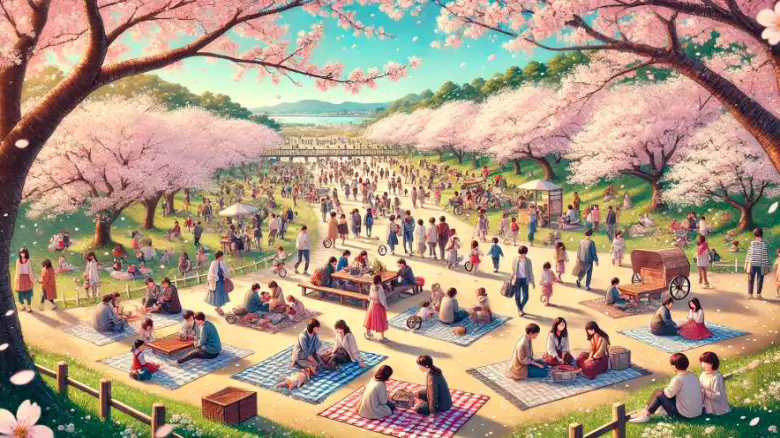 春爛漫の桜の下で、家族や友人、カップルがピクニックや散策を楽しむ風景。花びらが舞い、穏やかなひとときを演出します。