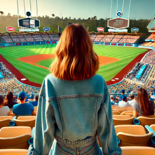 ドジャースタジアムの大観衆の中でMLBの試合を観戦する20代女性の後ろ姿